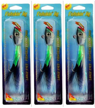 PROFISHCO Fishskin Jig 1.5 oz. Blueback Glo Shad 3 pack Inventory Reduction Sale The bucktail jig is an incredibly versatile lure, but it took ProFishCo to make it even more deadly. The FISHSKIN JIG features a lifelike head which is perfectly balanced on a super-sharp, premium quality hook to allow the jig to sail through the water more closely mimicking the swimming action of a live baitfish. It is dressed with a combination of natural bucktail and two types of Fishskin material. The sides and back are reflective with a scale pattern. The belly is luminescent so it glows even in the darkest water. The FISHSKIN JIG is great improvement on an old favorite. Try it and its sure to become your new favorite.Lifelike, Fish-Shaped Head, Chip Resistant Epoxy Paint Fishskin "Glo Fins" Large, "Scared-Prey" Eyes Fishskin Flash Upper Fins Oversized, Super Sharp Premium Quality MustadHook 100% Premium Natural Bucktail Deer Model Number Length Quantity Color PBT-150-03 5" 3 Blueback Glo Shad