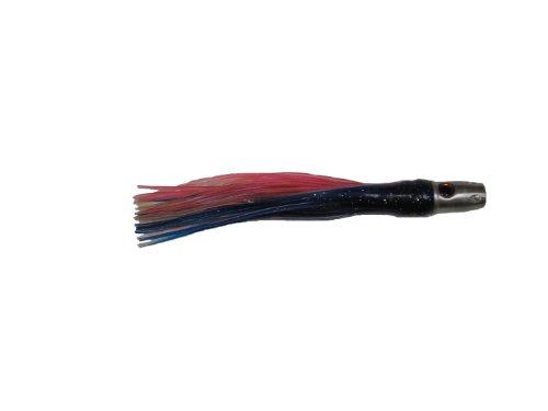Our Popular "Dolphin Dart". This Lure is killer on Dolphins and many other Pelagic Species, especially sailfish. This lure has a concave metal head with 4 jets and creates lots of smoke. The red eyes have a black center and look very real. We dress this lure with 2 layers of skirt material which is a premium grade of vinyl that is blue on top and pink on the bottom and impregnated with silver metal flake for a shimmering look. Ideal to run over a rigged bait such as a ballyhoo or rig and run by itself. All our lures are guaranteed to catch fish or your money back, no questions asked.
