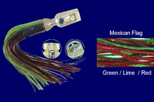 PROFISHCO Doornob Series Jet-Nob 13" Mexican Flag (Green/Lime/Red) A computer-designed lure that is ocean proven with strike-tested results. Most technologically advanced and productive lure you've ever put behind your boat. Attracts all pelagic fish, especially marlin, tuna, sailfish, dorado and wahoo. Optimal bubble trail from side vents. Maximum contrast with the highest visibility in all light situations. Superb tracking in all sea and wind conditions. Tough, tangle-free Fishskin skirts. All colors refract light in the blue/violet spectrum that gamefish see best. Teflon center tube to protect leader 1 Jet-Nobs Laminar flow over these hourglass-shaped heads creates a low pressure area which accelerates seawater as it passes rearward. This aeronautical principle results in a straight-running lure, capable of higher trolling speeds. 3 Fishskins Skirt Tough & Tangle Free 4 Computer designed Oversized, computer-designed side vents for optimal bubble trail and smoke. Large intakes and a deep concave surface